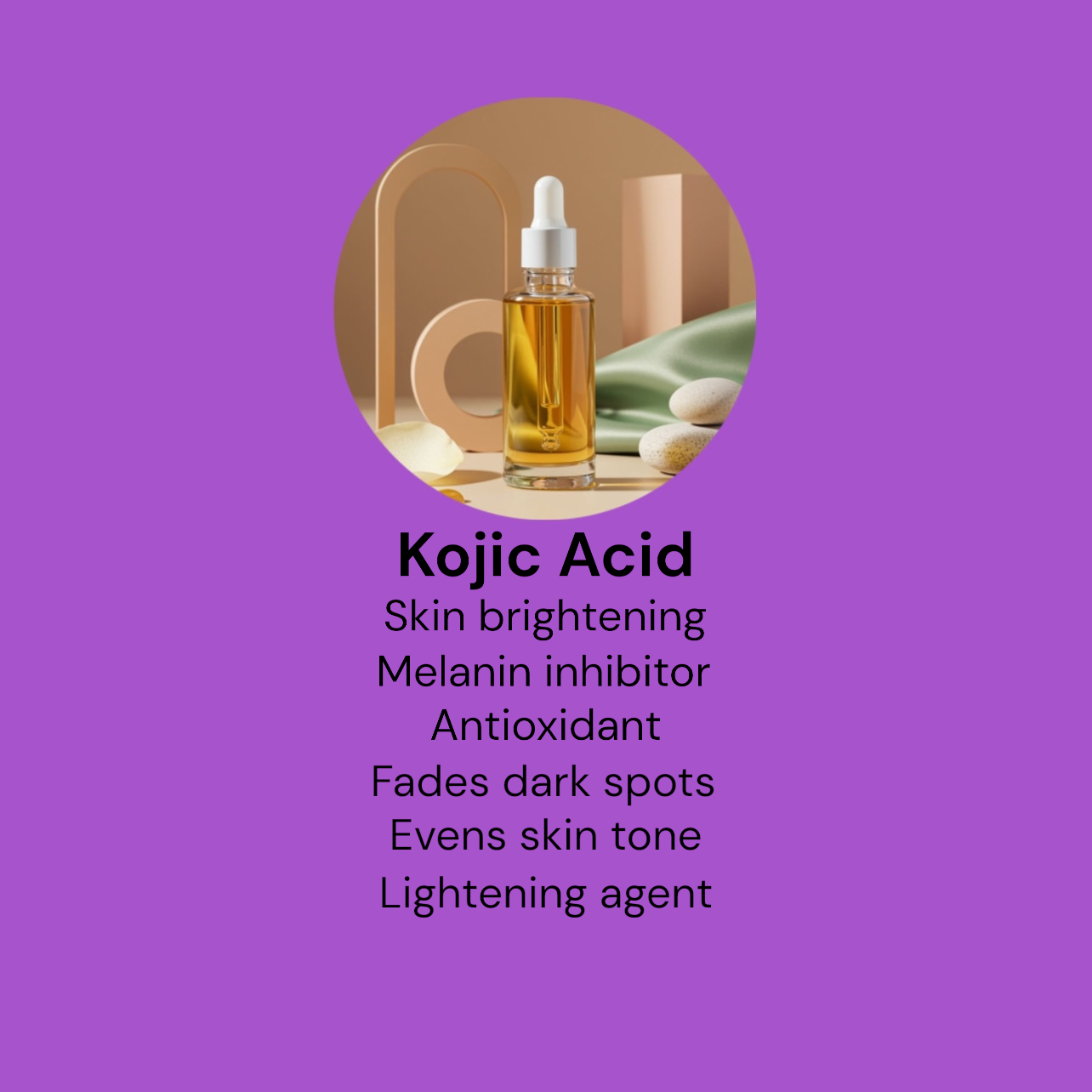 ⚪ Kojic Acid – Gently fades dark spots & evens out skin tone